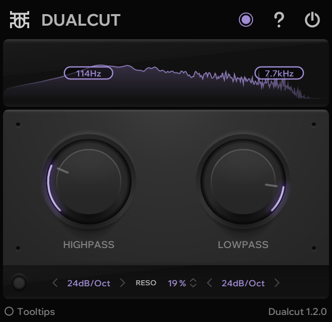 Low-pass and high-pass filters. From 12 up to 60 dB per octave slopes. Both parameters are smoothed for automation. Smooth auto-disable when no filtering is done. v1.2.0
