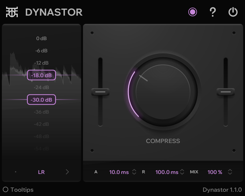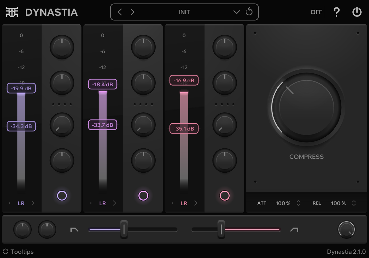 Upward and downward compression. Dynastia's dynamics processing in a compact form. Includes all the same modes as Dynastia. LR processes L and R separately, MS processes mid and side separately, MID processes mid only and SIDE processes side only. v1.1.1